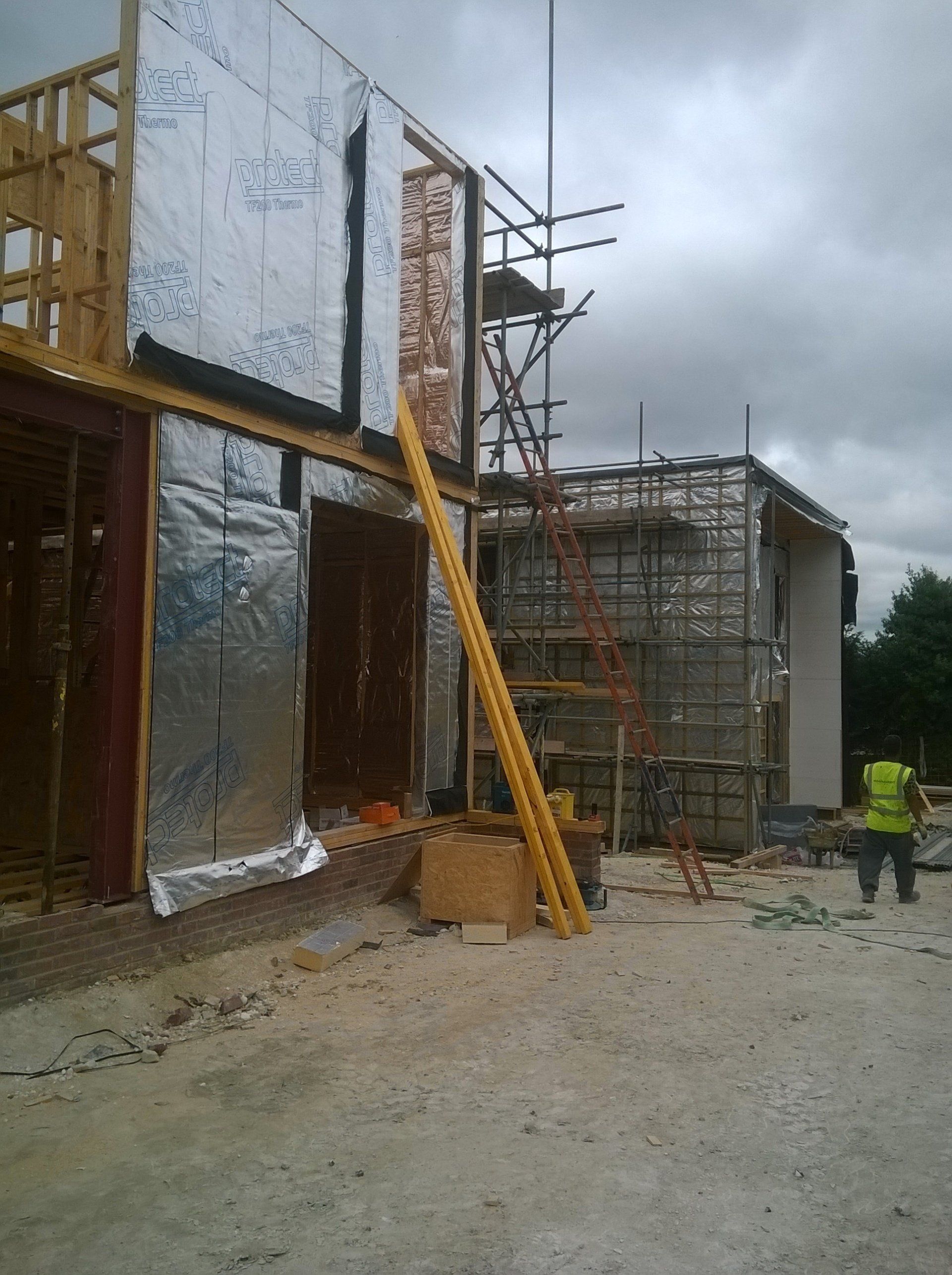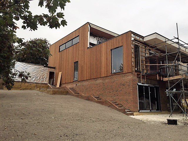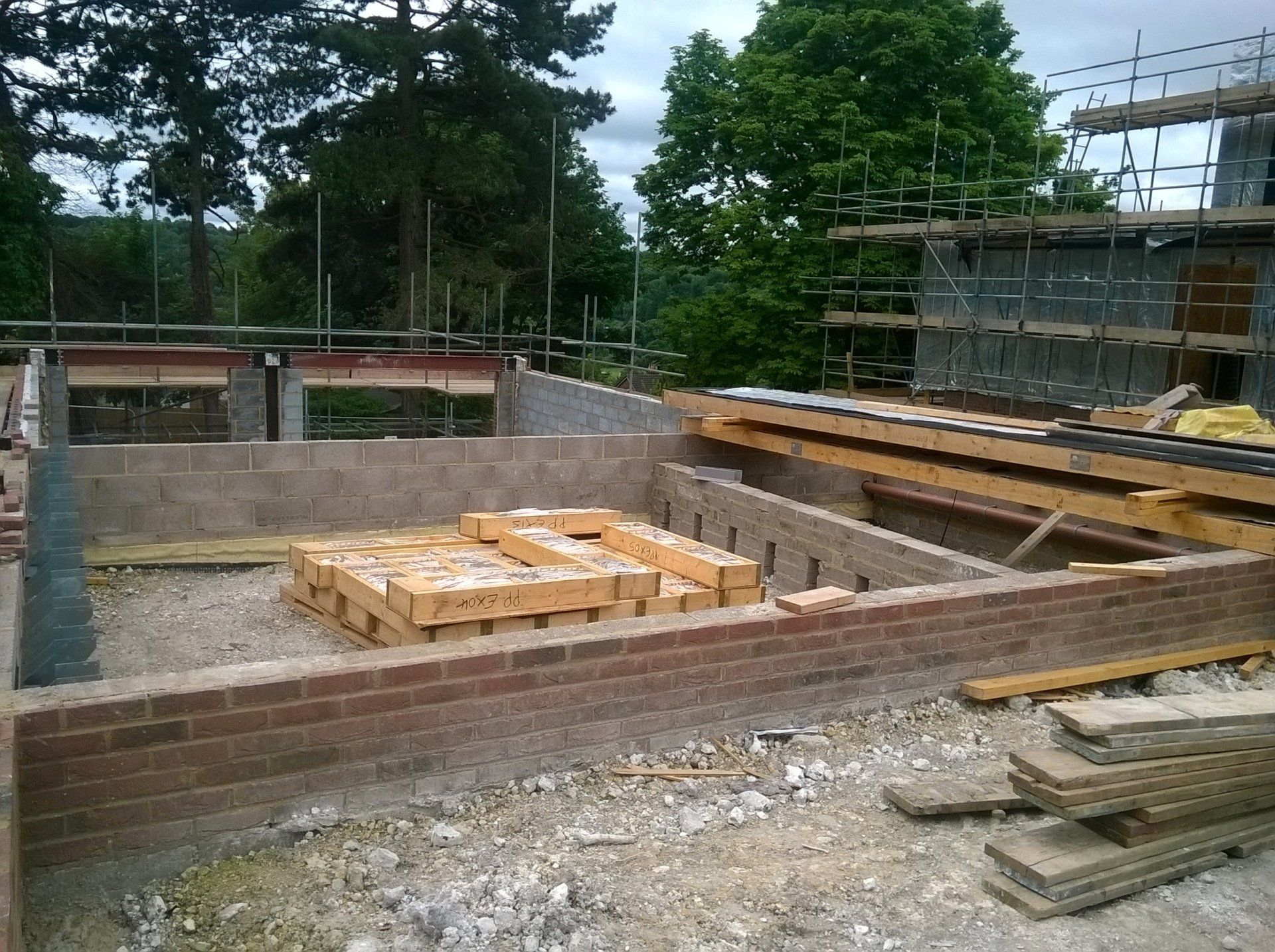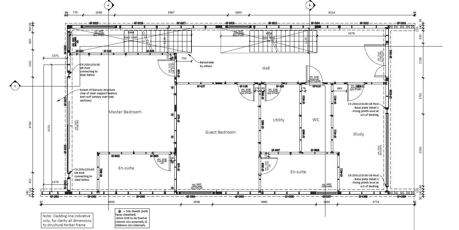 Like every bespoke project this one had its share of complications. The lower GF is formed using a retaining wall to 3 sides with a steel frame to the gable end (detailing as part of Mendip Timber Designs drawing package). This joists, timber frame and maze of supporting steelwork then sits over this.