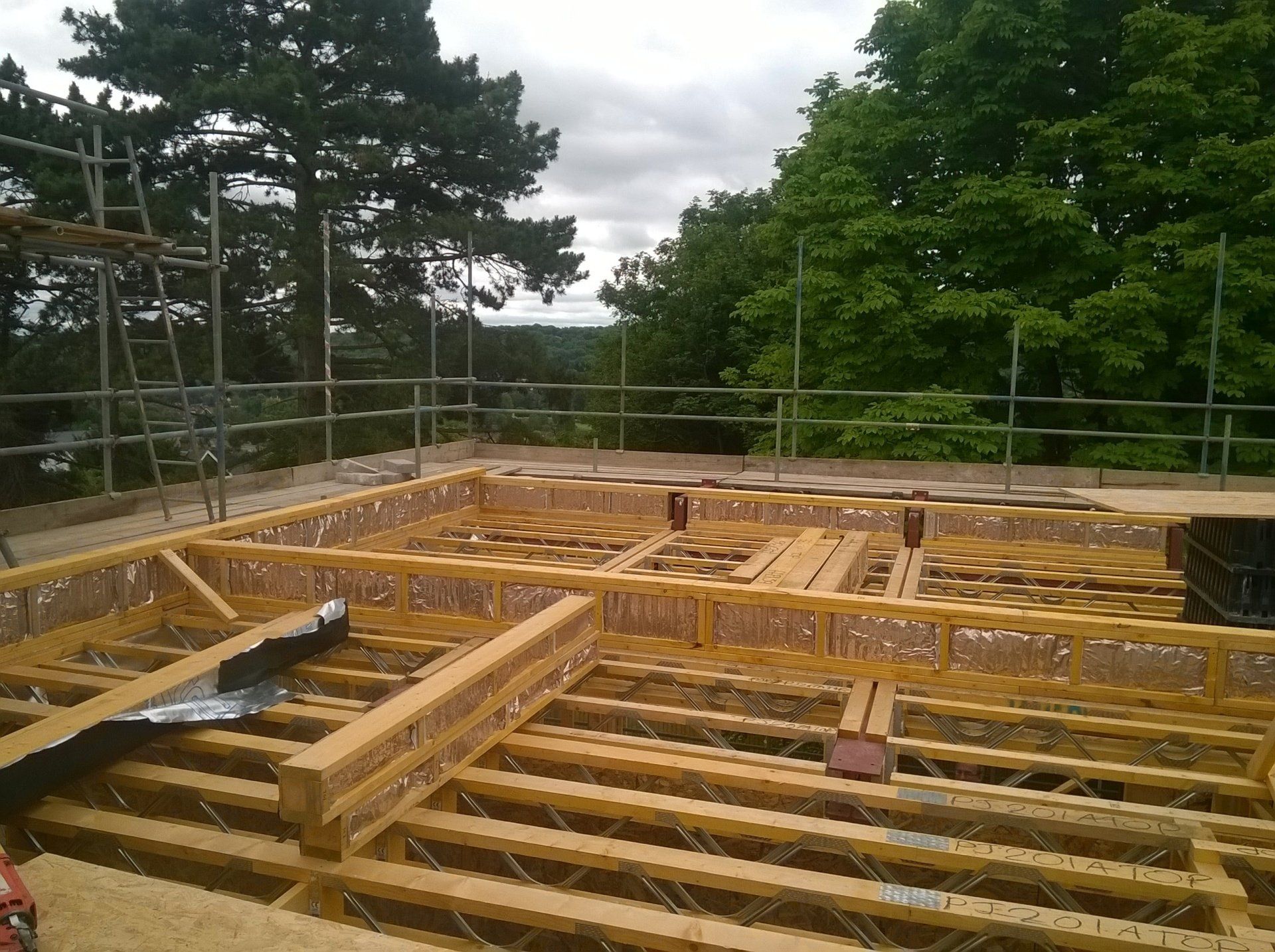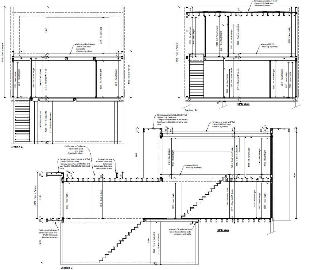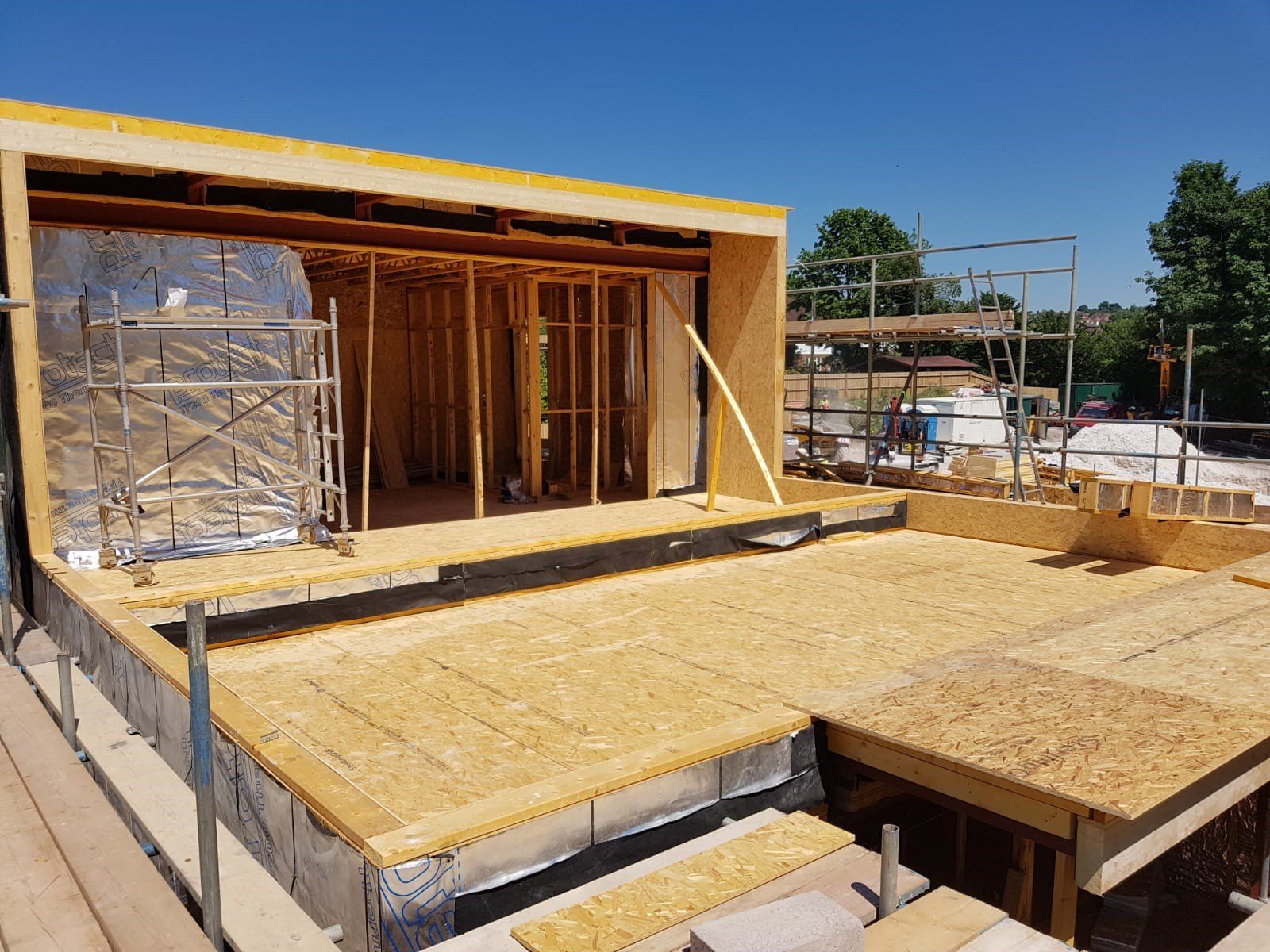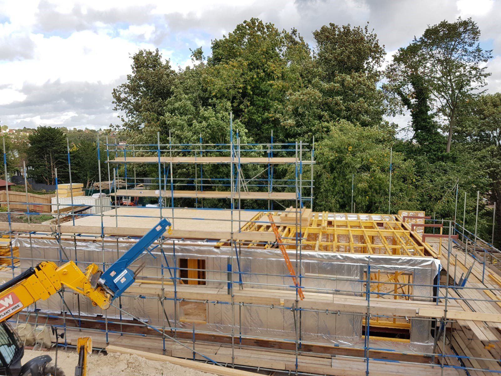 Like every bespoke project this one had its share of complications. The lower GF is formed using a retaining wall to 3 sides with a steel frame to the gable end (detailing as part of Mendip Timber Designs drawing package). This joists, timber frame and maze of supporting steelwork then sits over this.