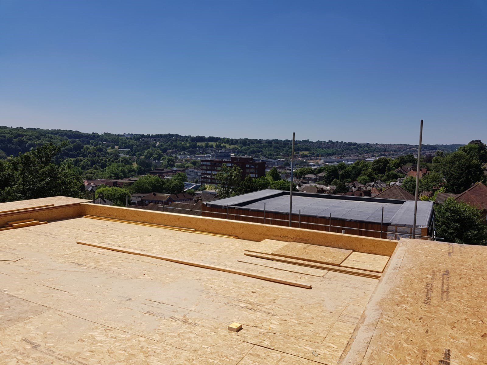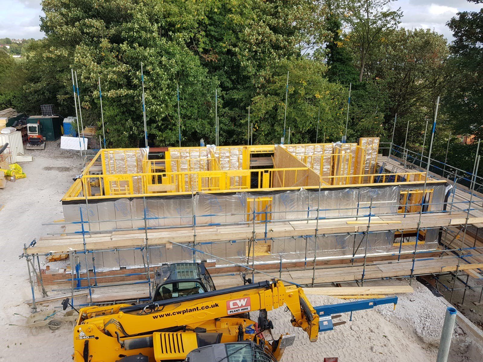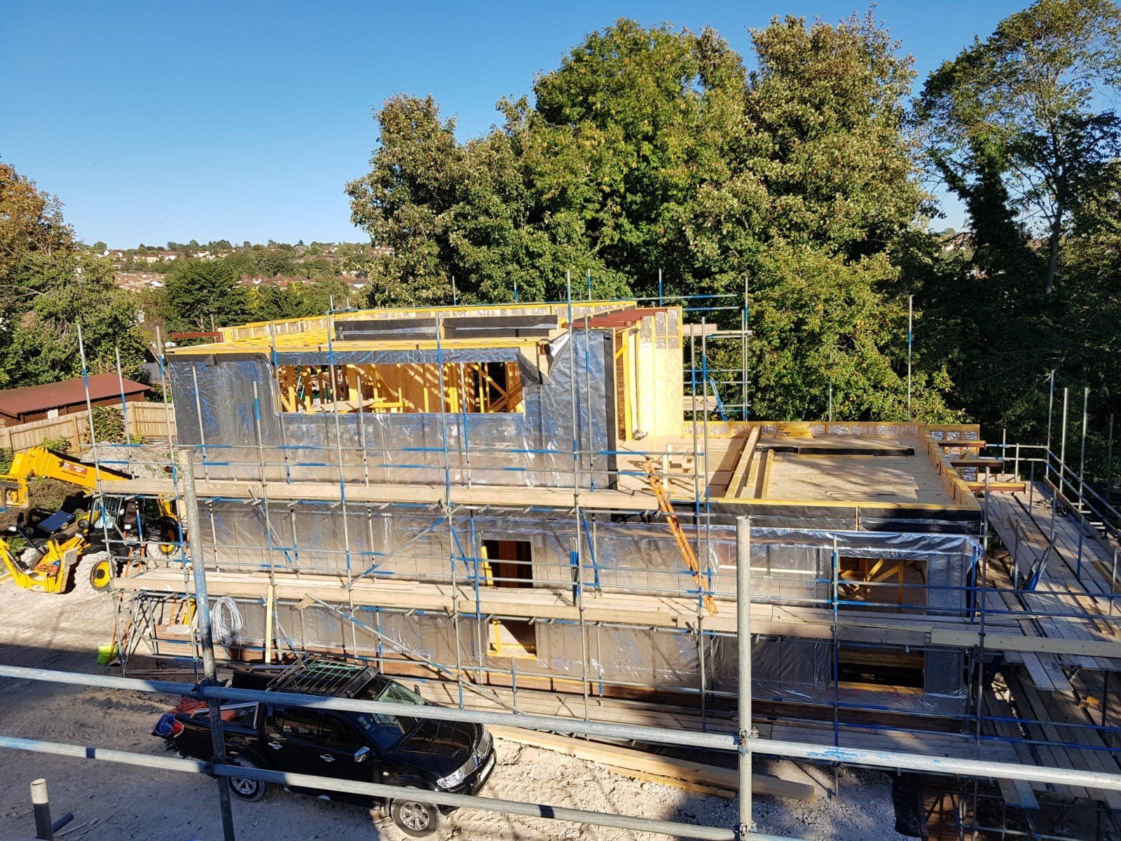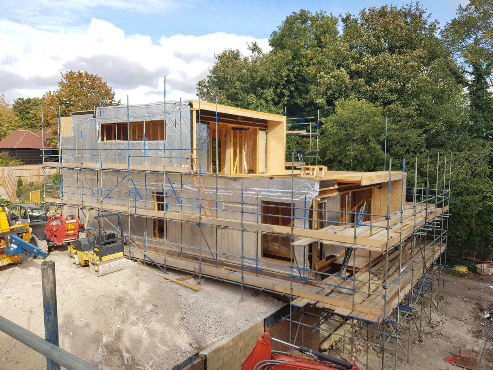 Like every bespoke project this one had its share of complications. The lower GF is formed using a retaining wall to 3 sides with a steel frame to the gable end (detailing as part of Mendip Timber Designs drawing package). This joists, timber frame and maze of supporting steelwork then sits over this.
